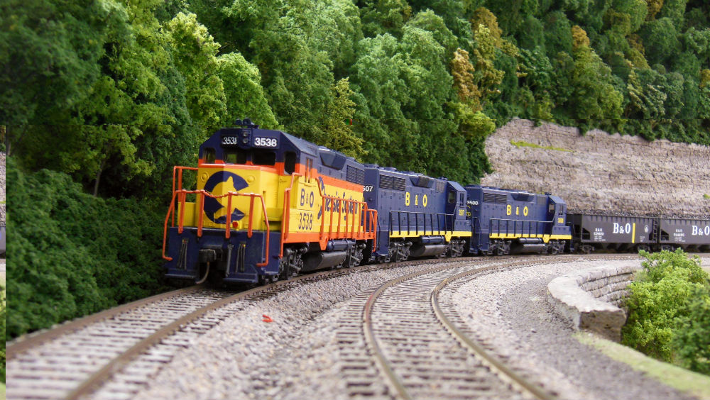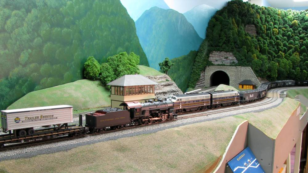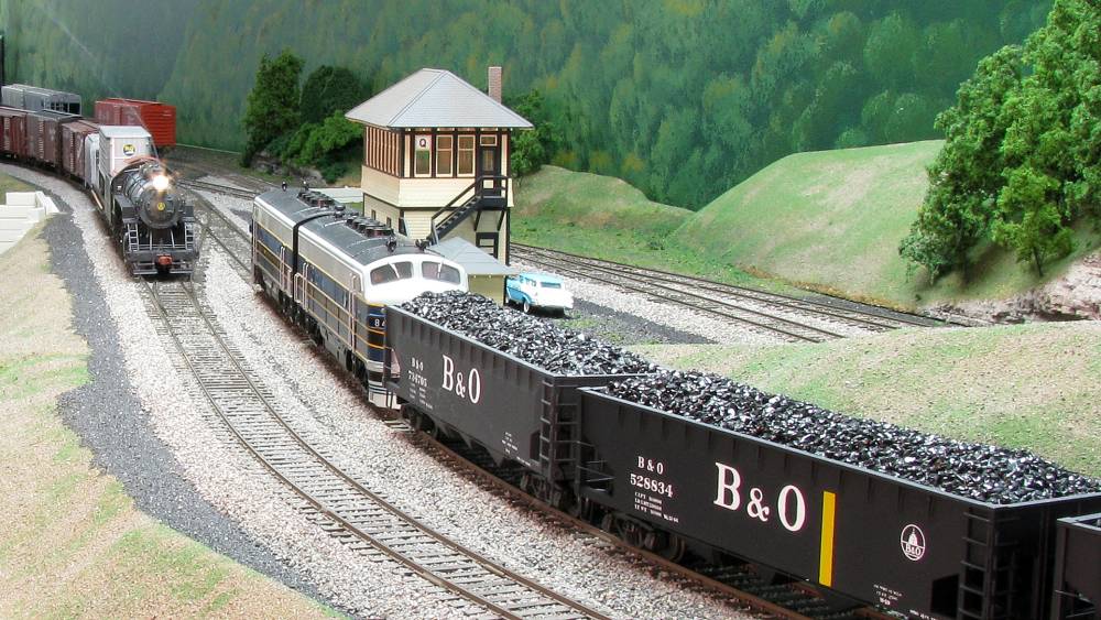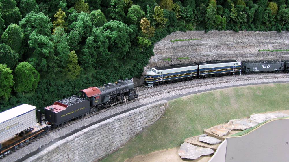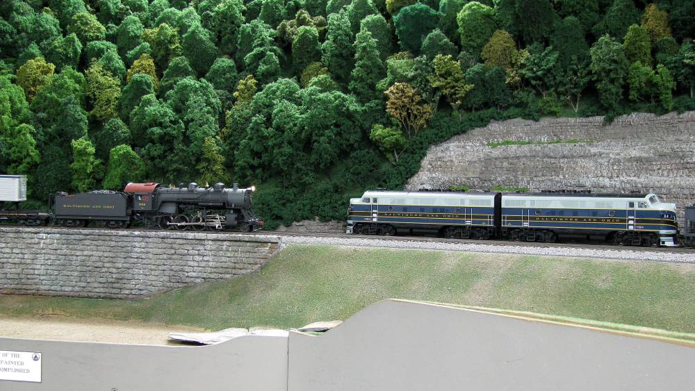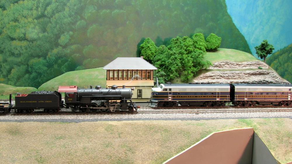 B&O #8, the eastbound Shenandoah, passes the eastbound Pittsburgher at New Castle Junction, PA