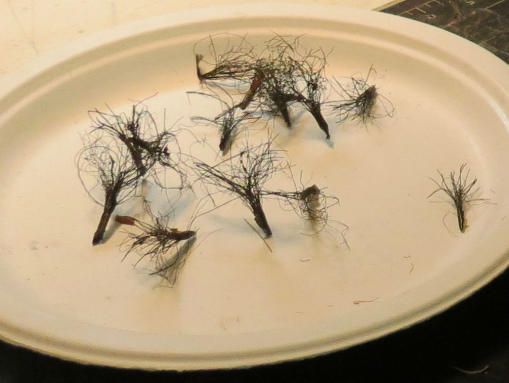 I wanted to make some new bushes for the HO layout of The Model Railroad Club that would look better than those made with polyfiber or clump foliage, especially up close. I think I came up with a method that is both cheap and easy.